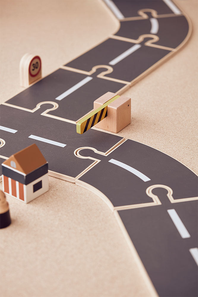 Contains eleven Kid's Concept wooden parts, including three parking spaces, a road barrier, six road sections and two extra-long parking spaces for the truck, fire truck and bus.