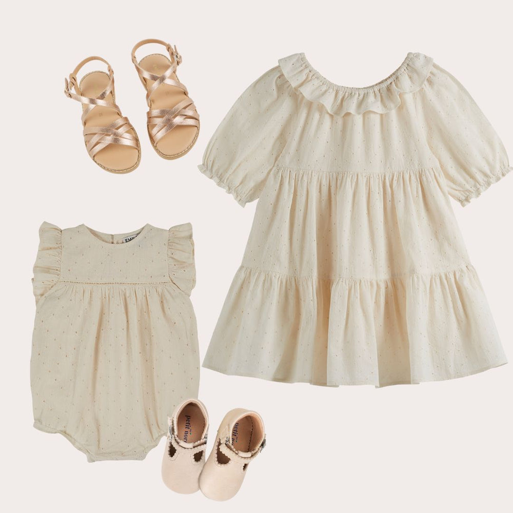 Découvrez le charme intemporel et la douceur de la robe fille Emile et Ida, une merveille de confection qui célèbre la beauté du coton léger, embelli de broderies anglaises. Avec sa coupe ample et fluide, agrémentée de manches courtes, cette robe offre à votre fille une liberté de mouvement totale. Le col rond volanté ajoute une note d'esthétique romantique, vintage et poétique qui fait battre les cœurs.