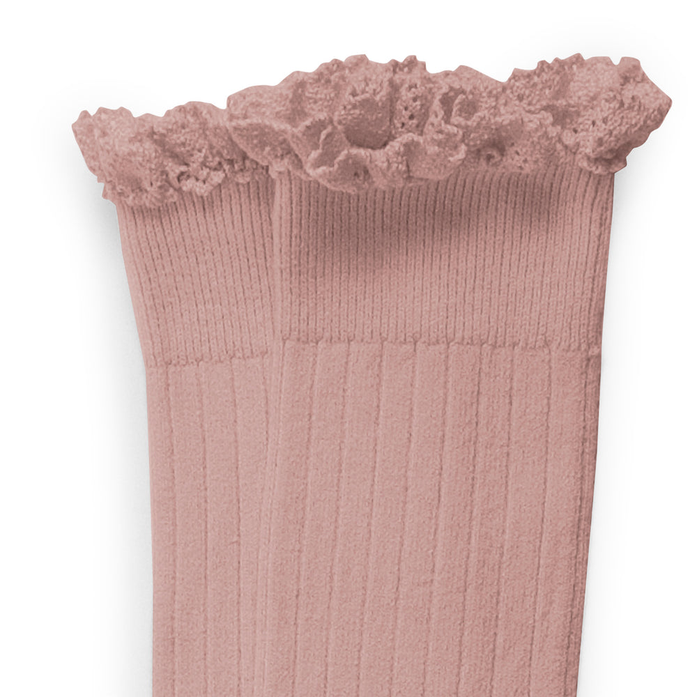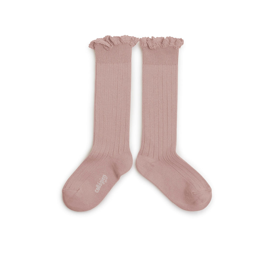 Le must des chaussettes hautes pour bébé et fille sont là ! Collégien nous propose ici le modèle Joséphine, des chaussettes hautes à côtes avec dentelle, si féminines. On craque sur sa couleur vieux rose parfaite pour le printemps.